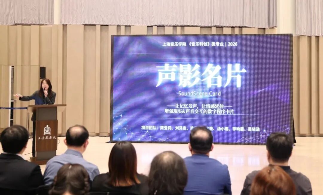 来自“音乐科创”微专业的同学们展示了交互式声音影像作品《声影名片》,由项目负责人龚爱莉代表团队现场演示如何通过语音指令触发定制化的视听叙事,充分表现了同学们在创意孵化、技术实现与用户体验设计上的综合能力,体现了该微专业“项目驱动教学”的典型成果,将人工智能、虚拟现实等技术与音乐艺术进行深度融合。