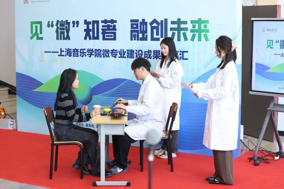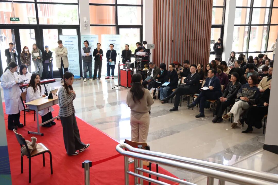 “音乐与健康”微专业的同学们做了两组场景展示。在《中外舒缓性音乐对睡眠困难大学生的干预效果对比研究》中,团队以中国传统古琴曲《流水》对睡眠困难大学生进行为期8周的对照干预,取得成效;在《歌唱对高焦虑留守儿童社交功能及亲子关系的干预效果评估》中,学生分饰医生、助理、留守儿童与家长,演绎了他们通过设计结构化歌唱活动,对高焦虑状态留守儿童进行12周团体干预,结果显示儿童的社交焦虑显著降低,亲子沟通频率与亲密度明显提升。两组同学生动的场景还原既是微专业“强化实践教学环节”的体现,也表现了音乐与健康这一微专业应用于真实社会服务场景的可能性。